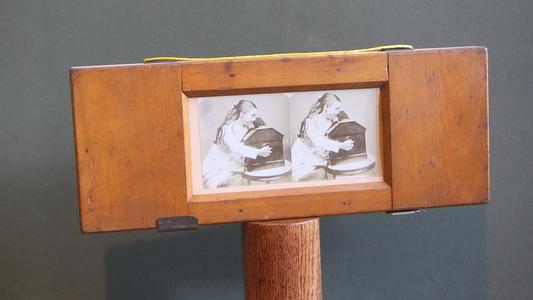 STEREOGRAPHISCOPE WITH A TINTYPE PHOTO FOR VIEWING THROUGH THE LARGE LENS.